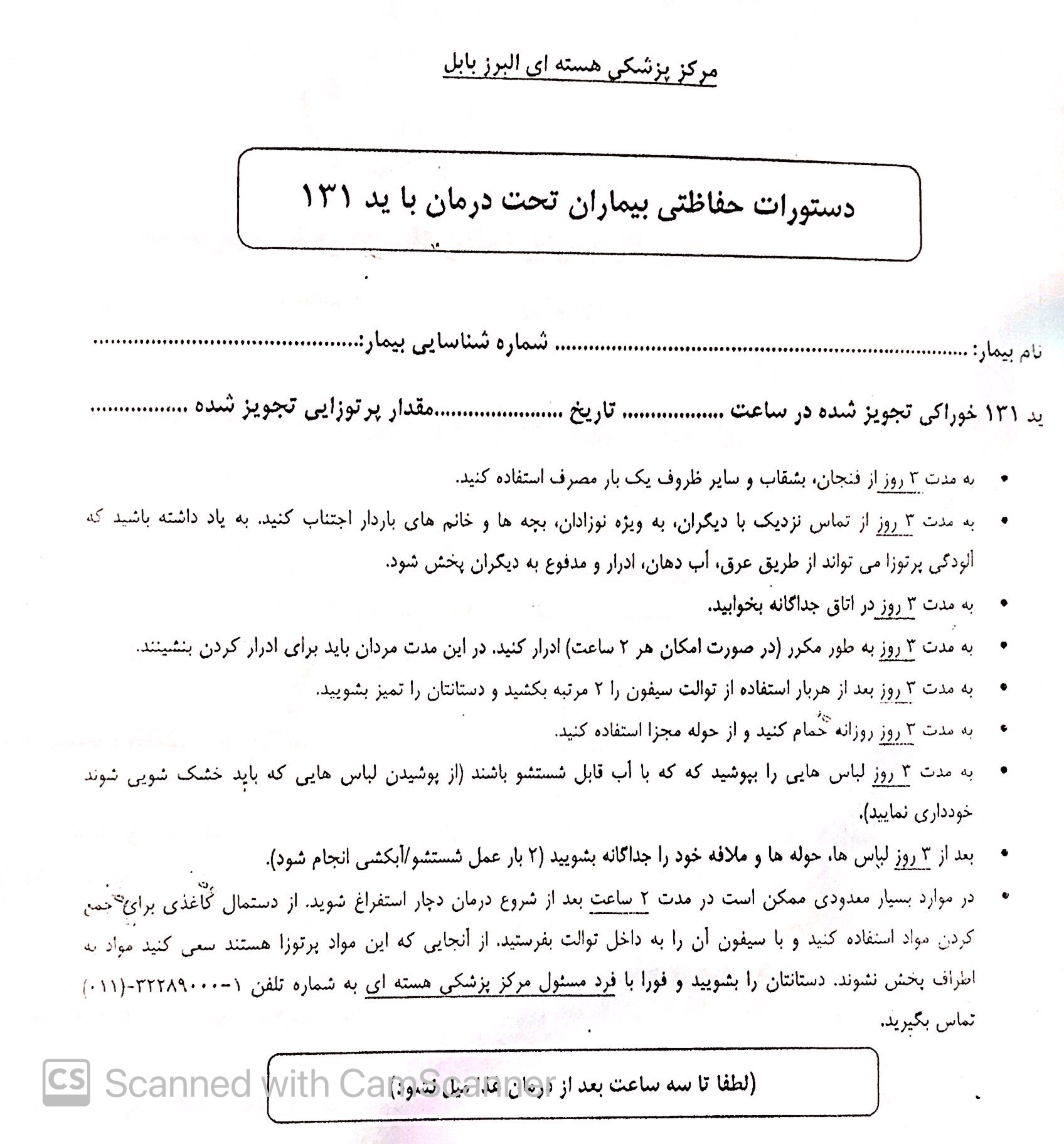 تا 24 ساعت بعد از دریافت ید فقط مایعات مصرف شود ، در صورت گرسنگی شدید سوپ ابکی یا اب گوشت مصرف شود